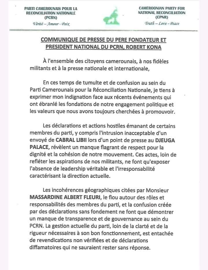 Deux jour après, il fait une conférence de presse à Yaoundé, ou il me traite de tous les noms d’oiseaux, il raconte tout et n’importe quoi, figurez vous qu’en ce moment la, il n’y a plus de dissencion interne, le Sous-préfet lui a délivré un récépissé de manifestation publique adressé à qui, à Président Fondateur du PCRN. Il ne se fait plus appeler président national, il a compris que c’est une supercherie et sa forfaiture, c’est connu de tous, maintenant il se fait appeler président fondateur, un titre qui n’existe nulle part, ni dans les statuts originels, ni dans les statuts que nous avons adopté. Et, la conférence de presse à quand même eu lieu au Djeuga Palace. Et curieusement, certains journalistes qui ont assisté à cette conférence de presse, etaient appelés directement du cabinet du ministre.