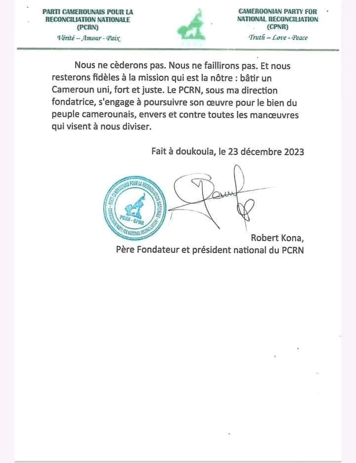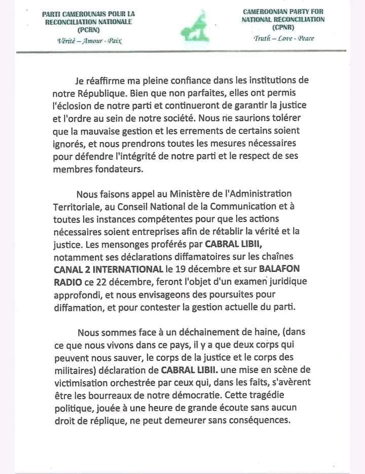 Interviewé sur Balafon Radio à Douala le Vendredi 22 Décembre dernier à 8hb30 environ dans l’émission Sacré Matin, Cabral Libii, président du PCRN répond à la question de Cyrille Bojiko, qui demandait : Qu’est ce qui se passe au PCRN ? Cabral poursuivant la réponse déclare : “Et donc, ils ont activé l’ex président de ce parti, qui fait partie d’un Groupe de fondateurs, des personnes qui ont créé le parti en 2001, et qui en ont obtenu la légalisation en 2003, et n’ont mené aucune activité de ce parti de 2003 à 2019, date à laquelle ils m’ont sollicité pour que je devienne le président.