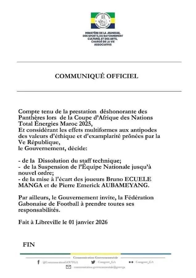 “Compte tenu de la prestation déshonorante des Panthères lors de la Coupe d’Afrique des Nations Total Énergies Maroc 2025, Et considérant les effets multiformes aux antipodes des valeurs d’éthique et d’exemplarité prônées par la République, le Gouvernement, décide: de la Dissolution du staff technique; de la Suspension de l’Équipe Nationale jusqu’à nouvel ordre; de la mise à l’écart des joueurs Bruno Ecuele Manga et de Pierre Emerick Aubameyang”, peut-on lire dans le communiqué publié sur les réseaux sociaux.