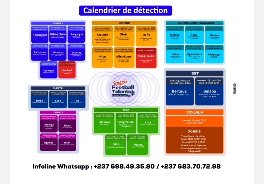 L’Union Camerounaise de Brasseries (UCB) à travers sa marque Razzl en partenariat avec la Kadji Sport Academy (KSA), organise du 1er Juillet au 1er Août 2024, une vaste campagne de détection de talents de footballeur, sur toute l’étendue du territoire national. La phase d’Inscription (gratuite) du Razzl Football Talent qui est déjà en cours, va du 1er au 21 juillet 2024, et la phase (pratique) de détection et des Grandes Finales auront lieu du 15 juillet au 1er août 2024, dans les régions du : Littoral, Centre, Ouest, Sud-Ouest, Nord, Extrême Nord, Adamaoua, Sud et l’Est. “Pour s’inscrire et participer, il faut aller sur le site web www.ksacademies.com ou les pages Facebook de Razzl et Kadji Sports Academy et suivre les instructions. Et également, se diriger vers les points de vente des boissons du groupe UCB, et les stades partenaires qui sont également des points d’inscription. D’après le DGA de la KSA, la campagne qui a recruté plus de 15 000 jeunes la fois dernière, vise pour cette année un peu plus plus. “lors de la précédente campagne, nous avons eu 15 000 enfants, cette année, nous visons un peu plus de 20 000 enfants au bout de la campagne.” a-t-il déclaré.
