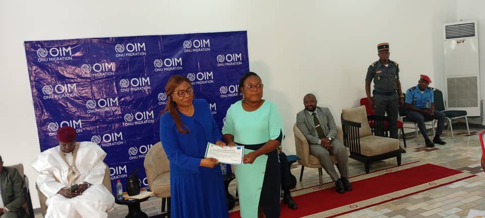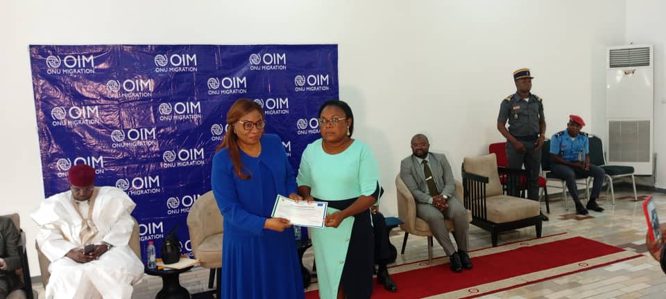 La première cérémonie a eu lieu à l’aéroport international de Yaoundé Nsimalen le 18 mars 2024. Ici, OIM veille à la formation et renforcement des capacités des partenaires pour un meilleur suivi des victimes. Elle a également fait une campagne de sensibilisation afin d’assurer une meilleure prise en charge des victimes, et la mise en œuvre des actions concrètes contre ces fléaux. À cet effet, 24 membres ont suivi une formation, et 4 d’entre eux ont reçu des attestations de fin de formation de l’approche intégrée de la réintégration des mains des personnalités présentes.
