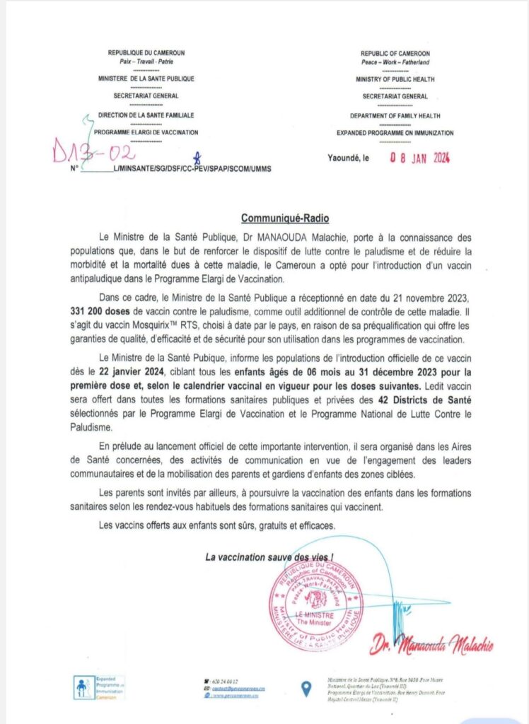 Dans le but de lutter efficacement contre le paludisme qui constitue un véritable problème de santé publique au Cameroun. Le Ministre de la Santé Publique Manaouda Malachie, a ordonné l’introduction du vaccin Mosquirix, nouvellement arrivé au Cameroun, dans le programme de vaccination des enfants, avec des détails et précisions. L’objectif étant de réduire la morbidité et de la mortalité du paludisme causées par le Plasmodium falciparum.