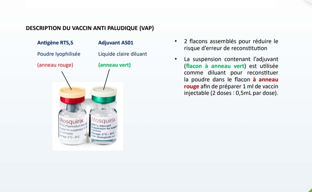 Le Mosquirix est administré gratuitement par injection, sur la cuisse gauche de l’enfant”, Explique Dr Tonga Calvin (Chef Section Planification et Suivi-Évaluation de GTC PEV) Le paludisme est une maladie grave et parfois mortelle, il représente la première cause de mortalité chez les enfants de moins de 5 ans. En 2020, on estime à 241 millions le nombre de cas de paludisme et à 627 000 le nombre de décès dans le monde (OMS 2022). Plus de 95 % des cas et des décès des enfants de moins de 5 ans surviennent en Afrique.