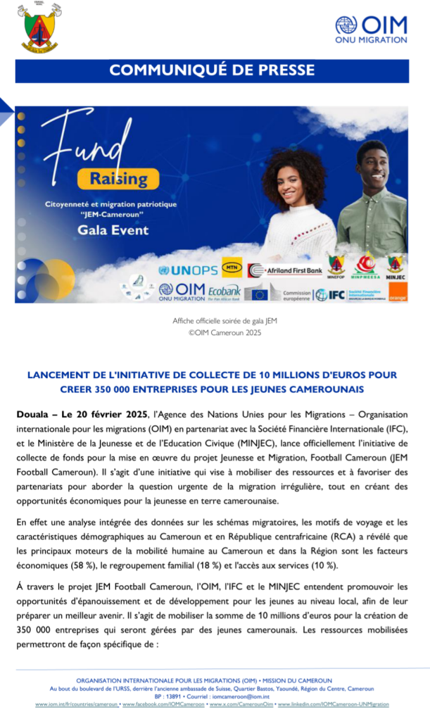 À cet effet, en partenariat avec la Société Financière Internationale (IFC), et le Ministère de la Jeunesse et de l’Education Civique (MINJEC), l’Agence des Nations Unies pour les Migrations a officiellement lancé l’initiative de collecte de fonds pour la mise en œuvre du projet Jeunesse et Migration, Football Cameroun (JEM-Football Cameroun). I’initiative vise à mobiliser des ressources et à favoriser des partenariats pour aborder la question urgente de la migration irrégulière, tout en créant des opportunités économiques pour la jeunesse en terre camerounaise.