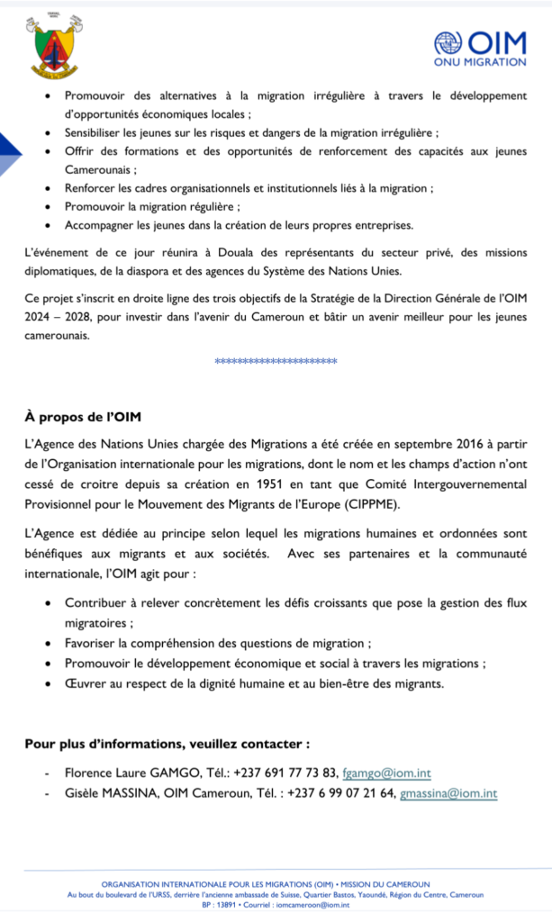 L’OIM fait savoir qu’il s’agit de mobiliser la somme de 10 millions d’euros pour la création de 350 000 entreprises qui seront gérées par des jeunes camerounais. Les ressources mobilisées permettront de façon spécifique de : Promouvoir des alternatives à la migration irrégulière à travers le développement d’opportunités économiques locales ; Sensibiliser les jeunes sur les risques et dangers de la migration irrégulière ; Offrir des formations et des opportunités de renforcement des capacités aux jeunes Camerounais ; Renforcer les cadres organisationnels et institutionnels liés à la migration ; de Promouvoir la migration régulière ; Accompagner les jeunes dans la création de leurs propres entreprises.
